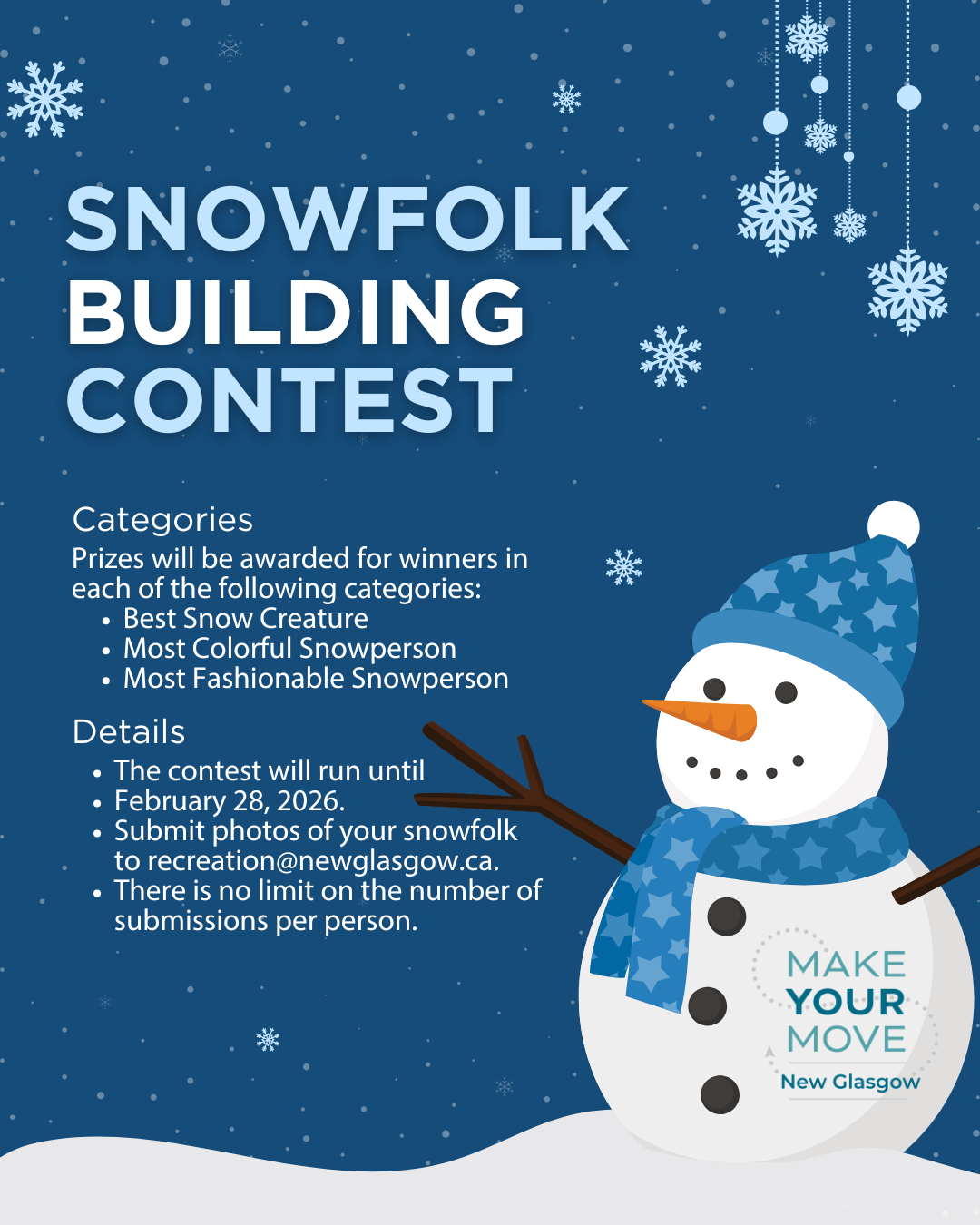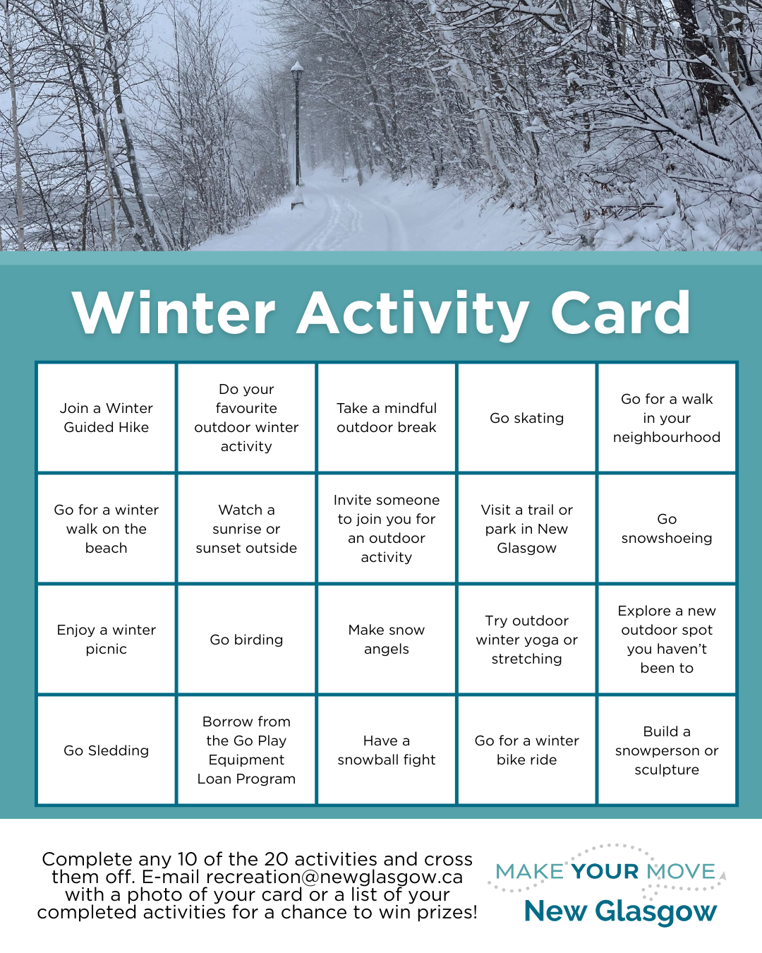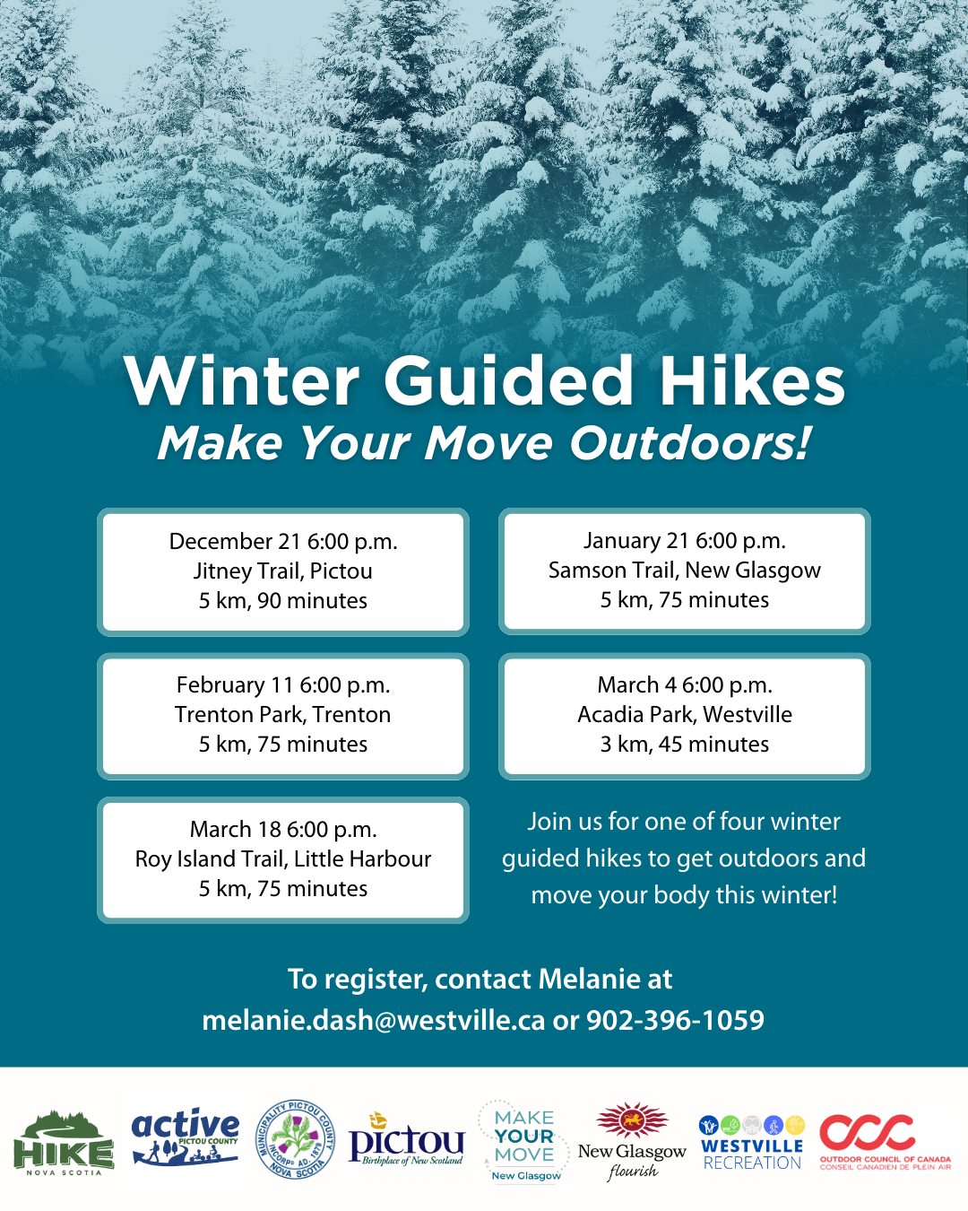 Join us for one of four winter guided hikes to get outdoors and move your body this winter! This guided hike series is a partnership between Make Yout Move New Glasgow (Town of New Glasgow), Active Pictou County (Municipality of Pictou County/Town of Pictou) and Westville Recreation (Town of Westville). To register, contact Melanie at or 902-396-1059.